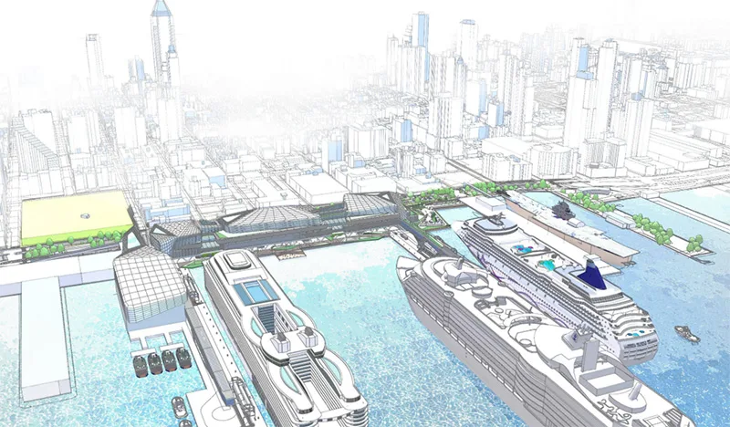 • The terminal now uses aging piers and infrastructure that date back nearly 90 years. The master plan responds to this by proposing brand-new piers and a consolidated terminal building — enabling the terminal to berth two 8,000-passenger ships and one 6,000-passenger ship simultaneously. (Think Icon size.)